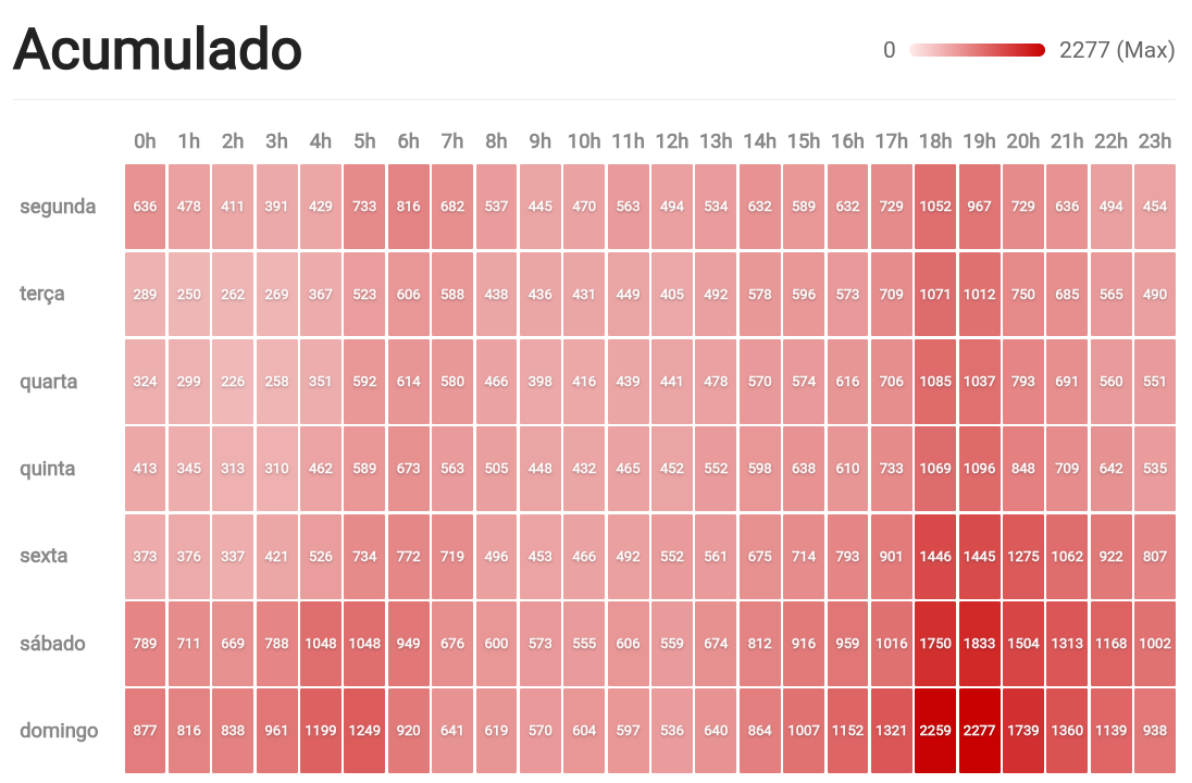 A figura abaixo evidencia a resposta: domingos registram o maior volume de mortes entre 18h-19h, seguidos pelos sábados no mesmo horário.