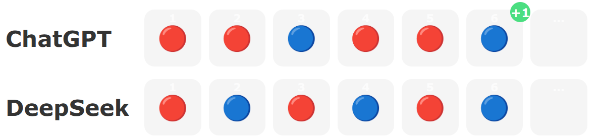 I stored all game data in JSON files (one file per game) containing: the round number, both agents' color choices along with their reasoning (limited to 15 words), the current cumulative score, and each agent’s identity (ChatGPT or DeepSeek). The reasoning is what the model returns in response to the following prompt: “Explain in 15 words or less why you chose that color based on the pattern”. For more details, see flag_game.py in the GitHub repository.